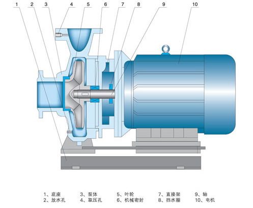 1、底座 2、放水孔 3、泵体 4、取压孔 5、叶轮 6、机械密封 7、直接架 8、挡水圈 9、轴 10、电机