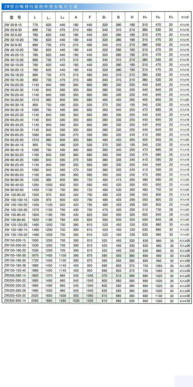 备注:以上参数选型表只是ZW自吸式无堵塞排污泵的部分性能参数,如在上表中没有找到符合贵单位要求的型号参数可以向我们咨询,我们有专业的工程师为您提供常规产品中没有的参数选型,更加精准的选出适合贵单位适用的排污泵型号产品。